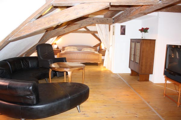 Das Studio ist Denkmalgeschützt und mit 300 Jahre alten Balken.  Im Studio finden Sie viel Platz auf der neuen schönen Ledercouch und ein sehr schönes Italienisches Rokoko- Bett mit viel Platz  (200x200cm) bietet Ihnen ein Wohlbefinden auch in der Nacht.  Auf der anderen Seite des Großraumstudios ist ein weiteres Bett (140x200 cm ) vorhanden. Ebenso ist hier das Tageslicht Badezimmer mit Dusche und Badewanne.
