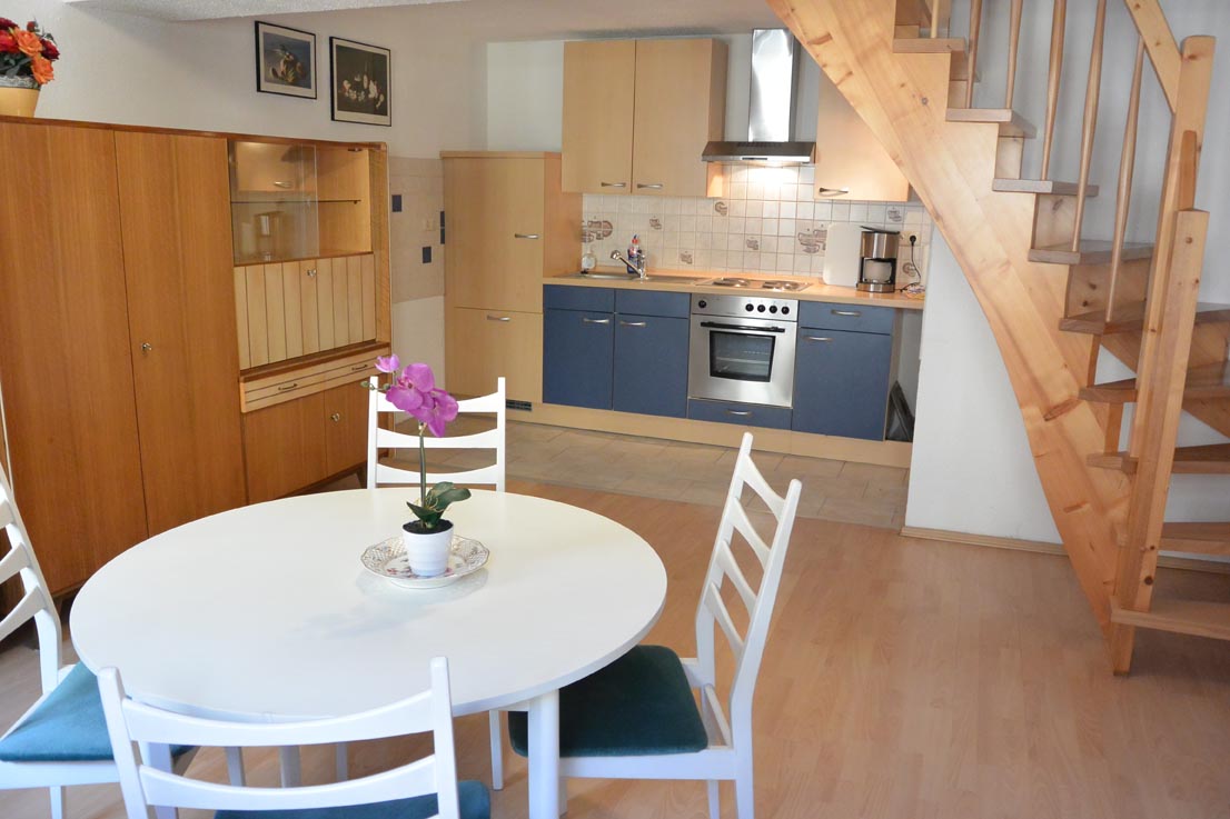 Hier geht es vom der großen Wohnküche mit einer schönen Massivholz-Treppe in das Antikbalken-Studio.